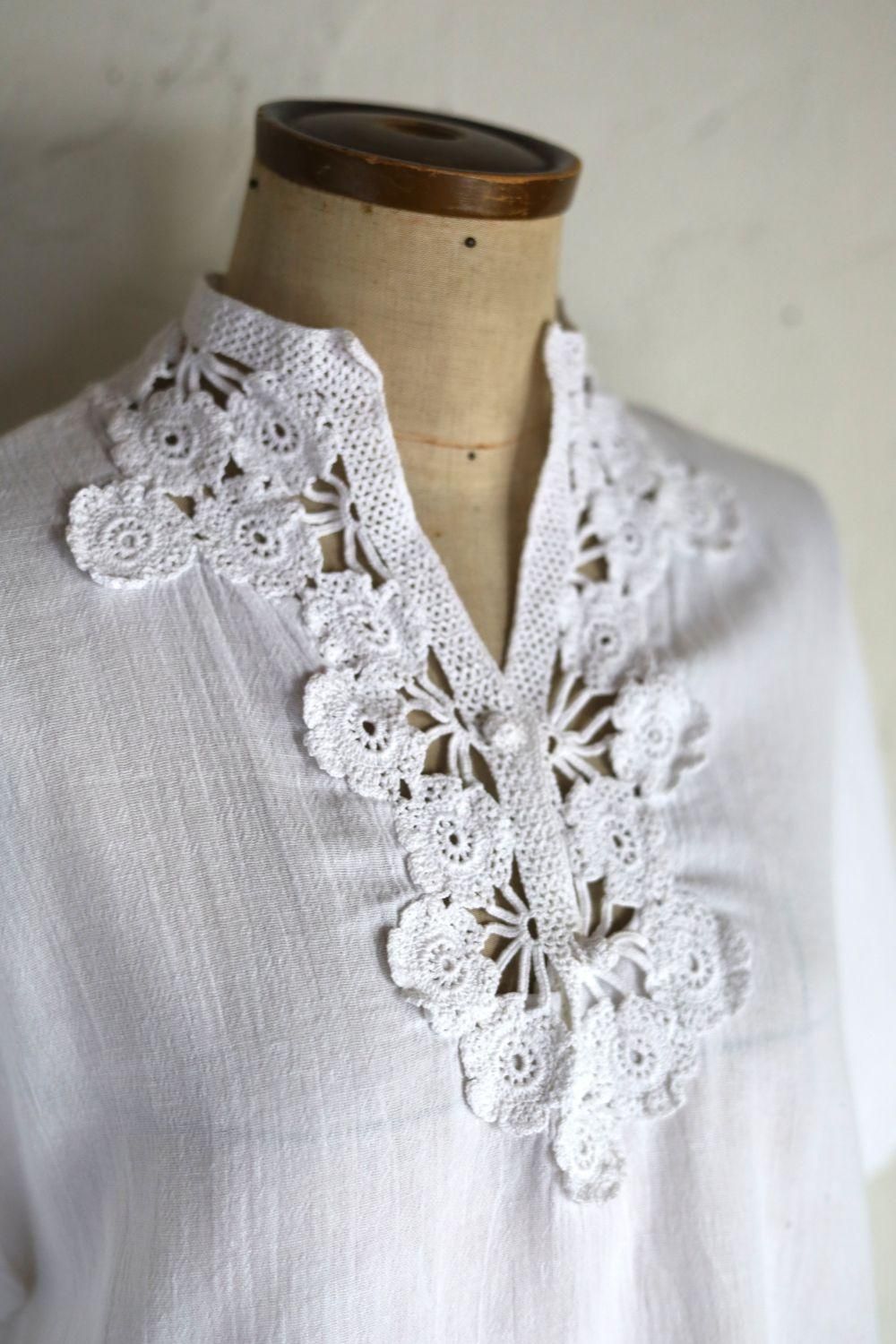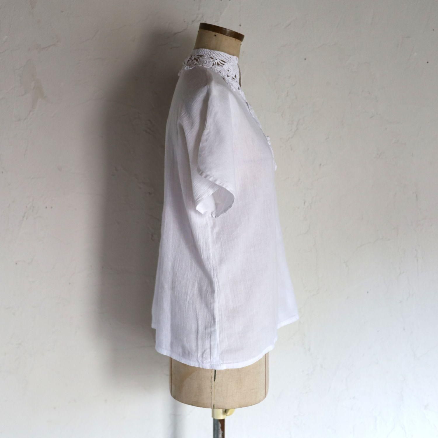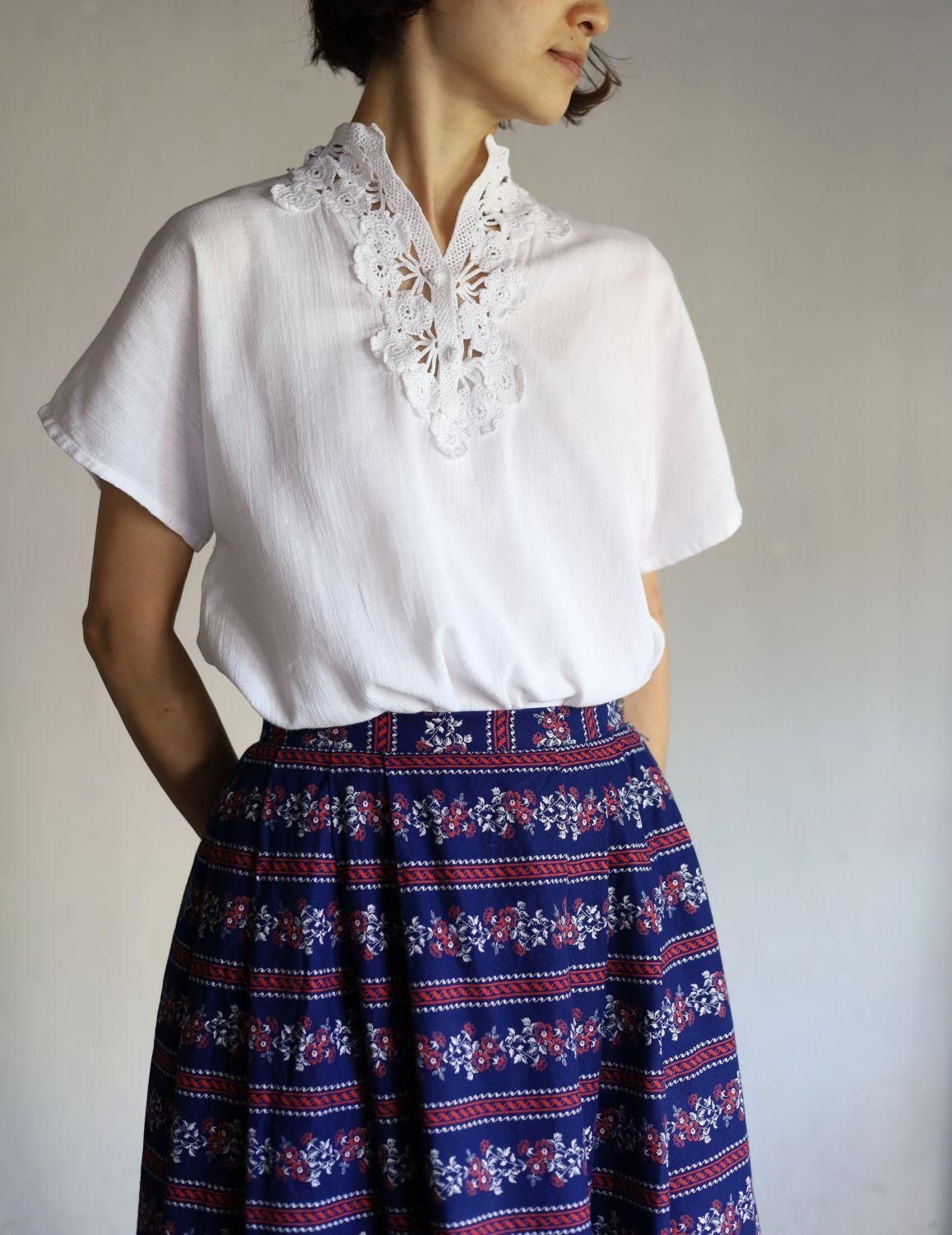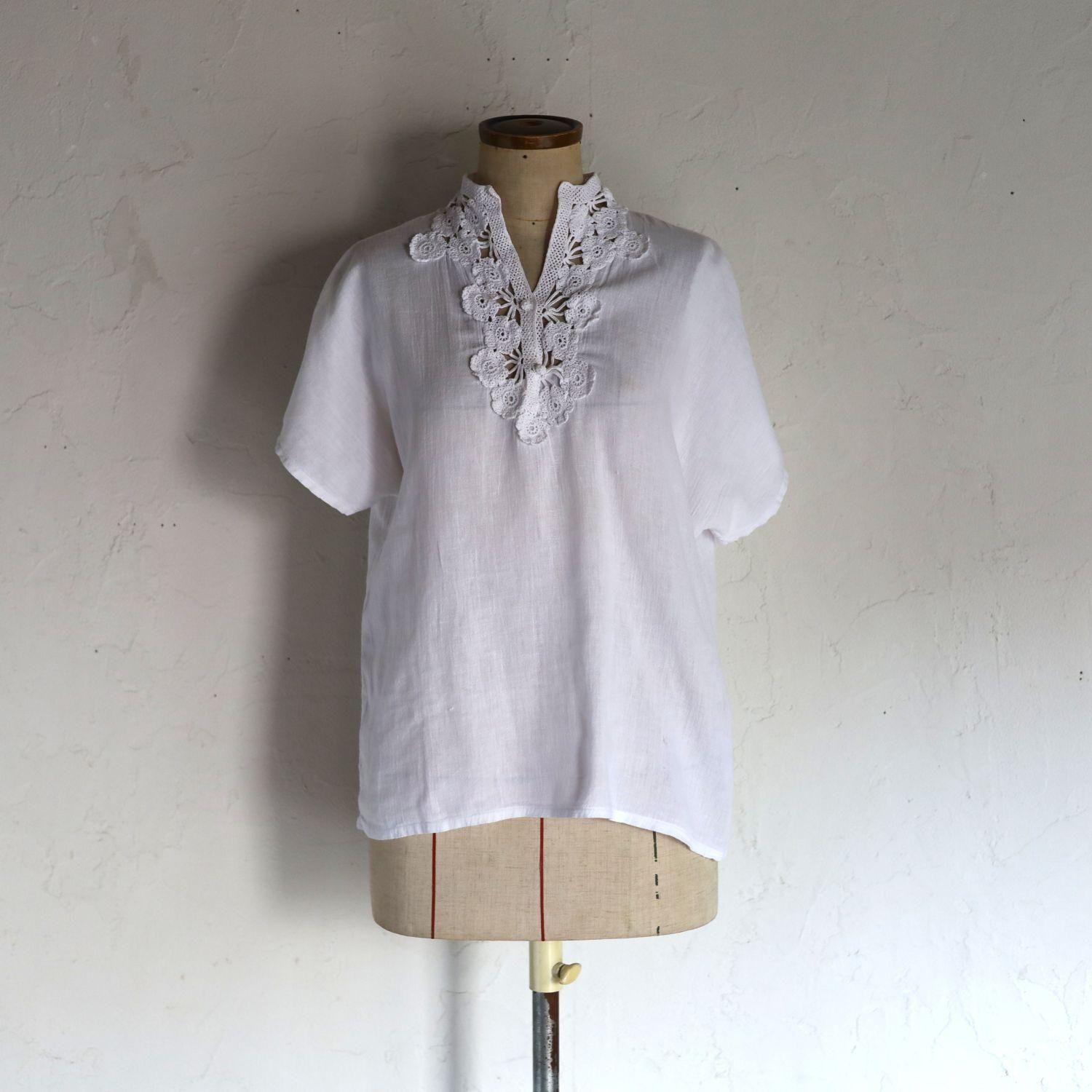 一枚でさらっと気持ち良いコットンブラウス。お花が連なったレース、ボタンまでもが編み込まれていて密かなアクセントに。Tシャツ感覚で着られる気軽さがありつつ、特別感のある一枚。