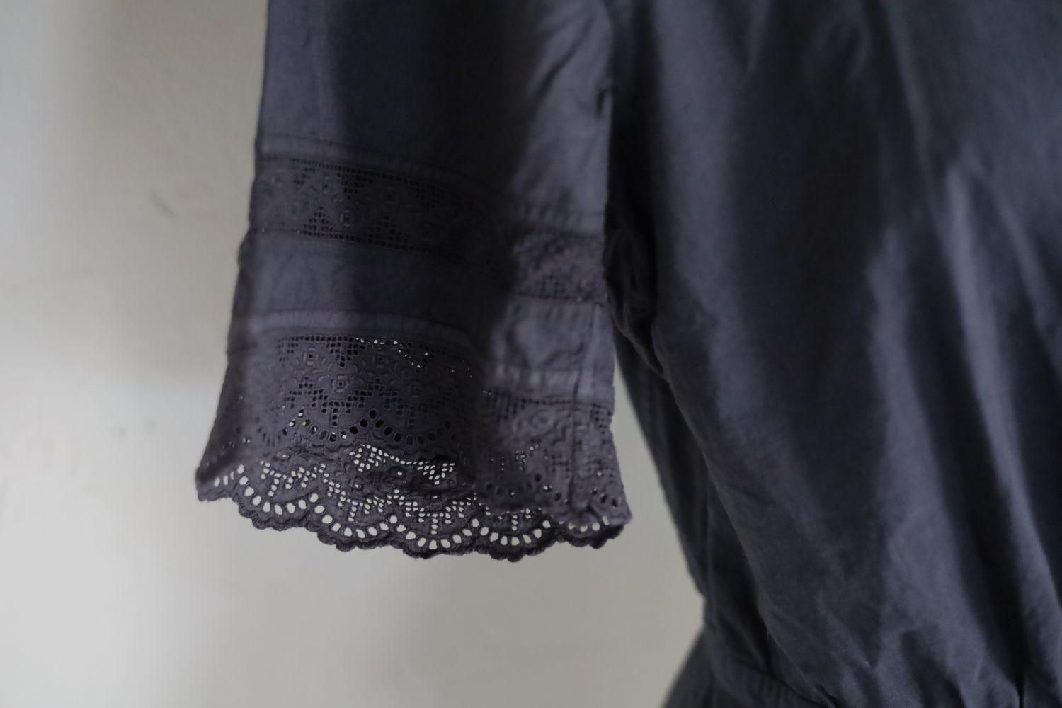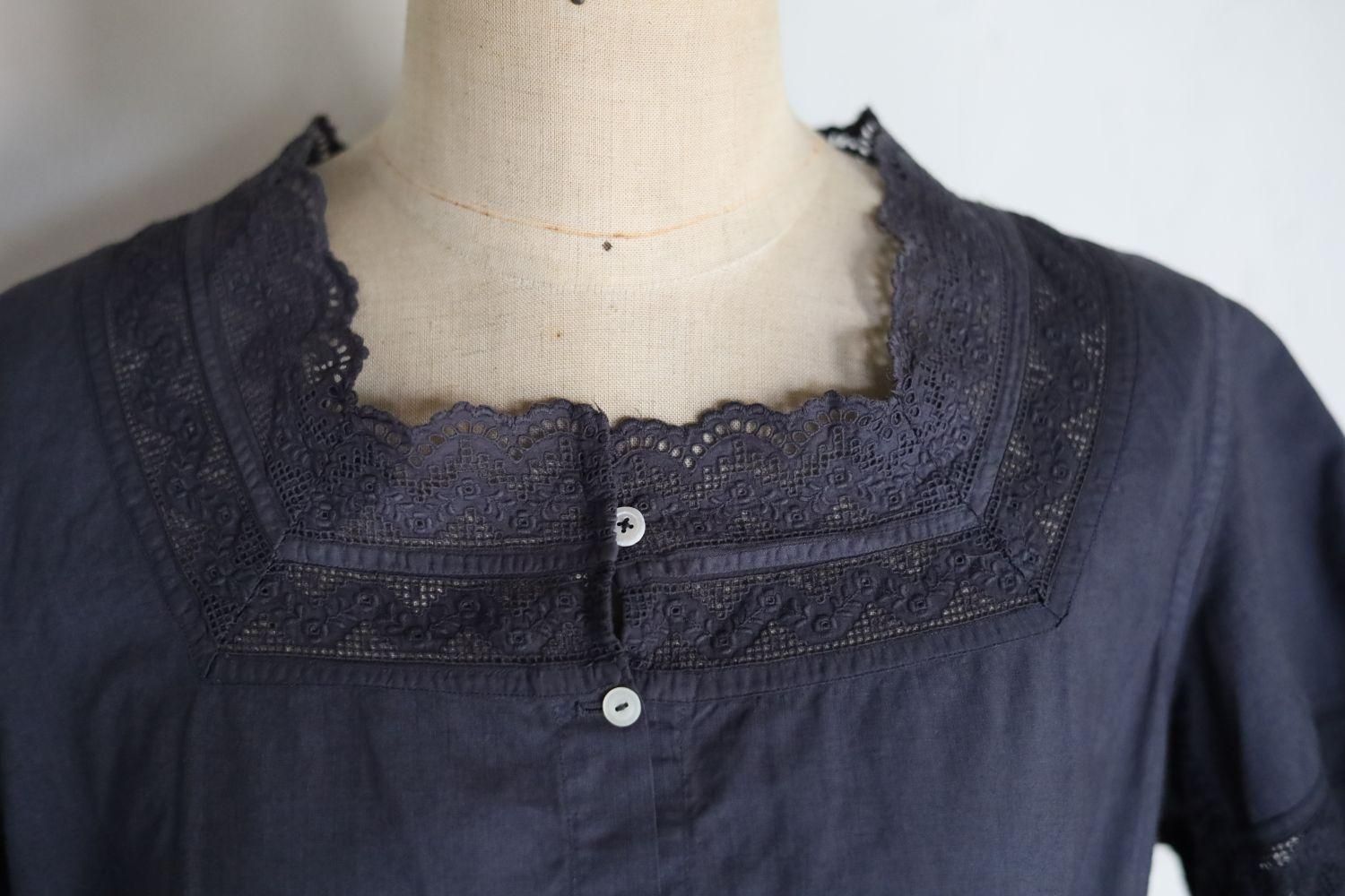 いつもcaikotの服を集めてくれているフランスのマダムに染めていただいた後染めブラウス。元々は1900年代初期のものです。繊細なレースやこの時代特有の小さな貝ボタンが美しく、ハリのあるコットンは肌に馴染みます。