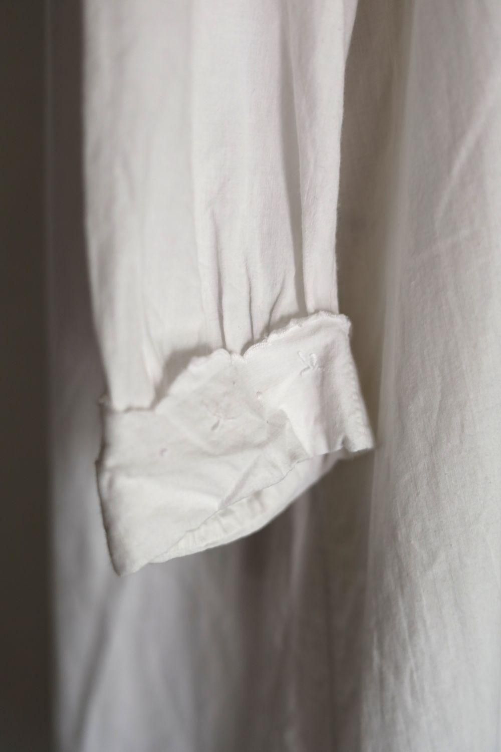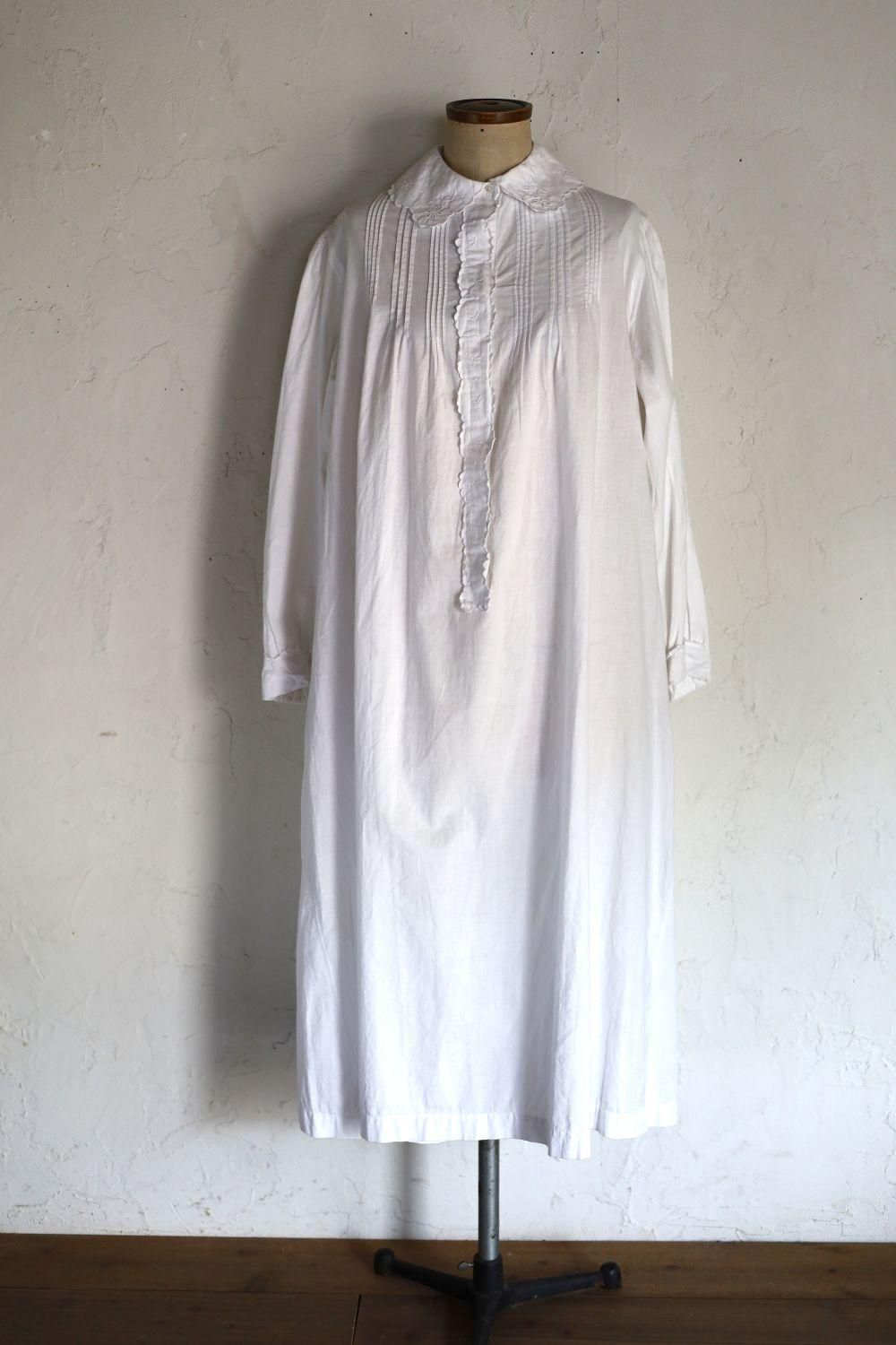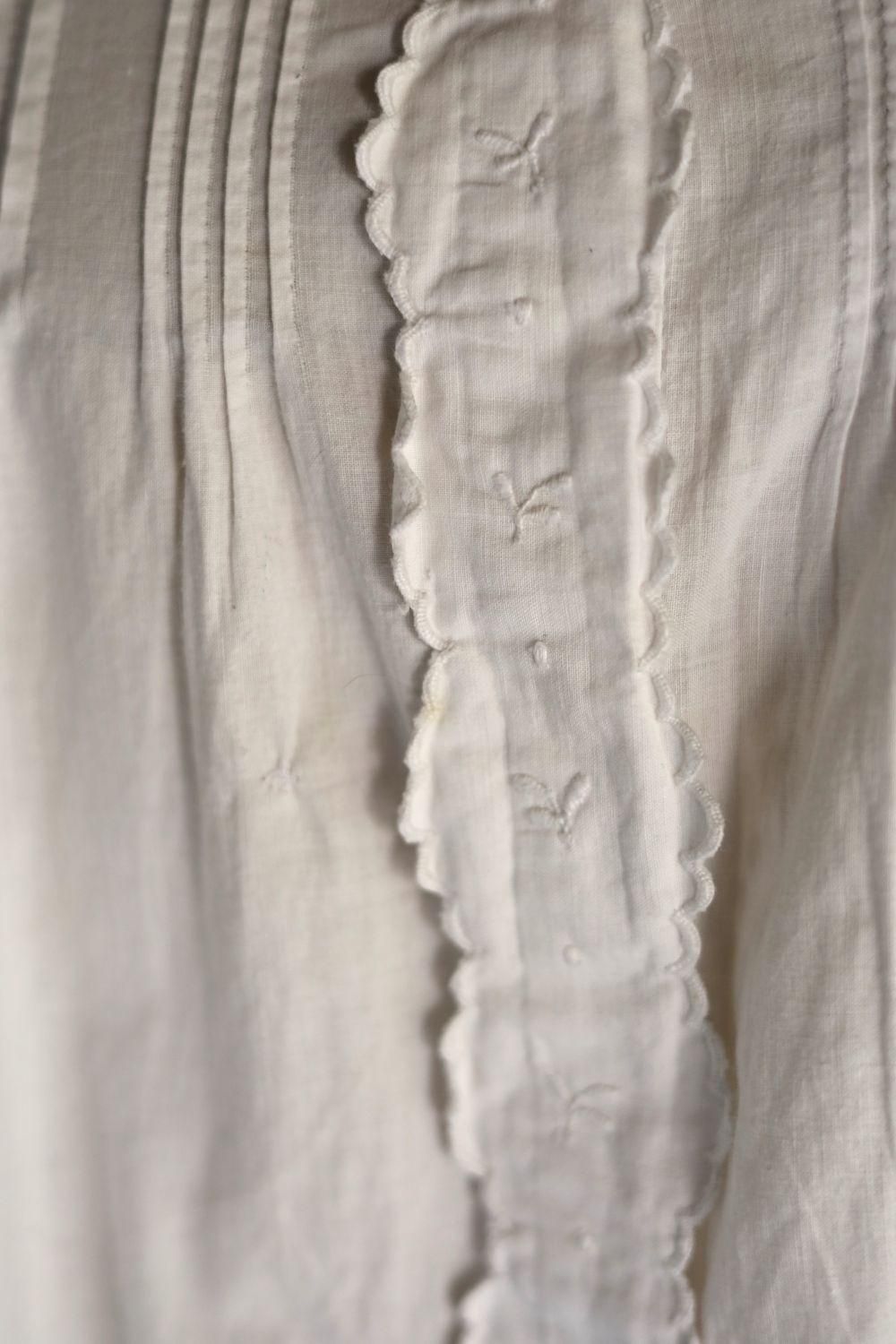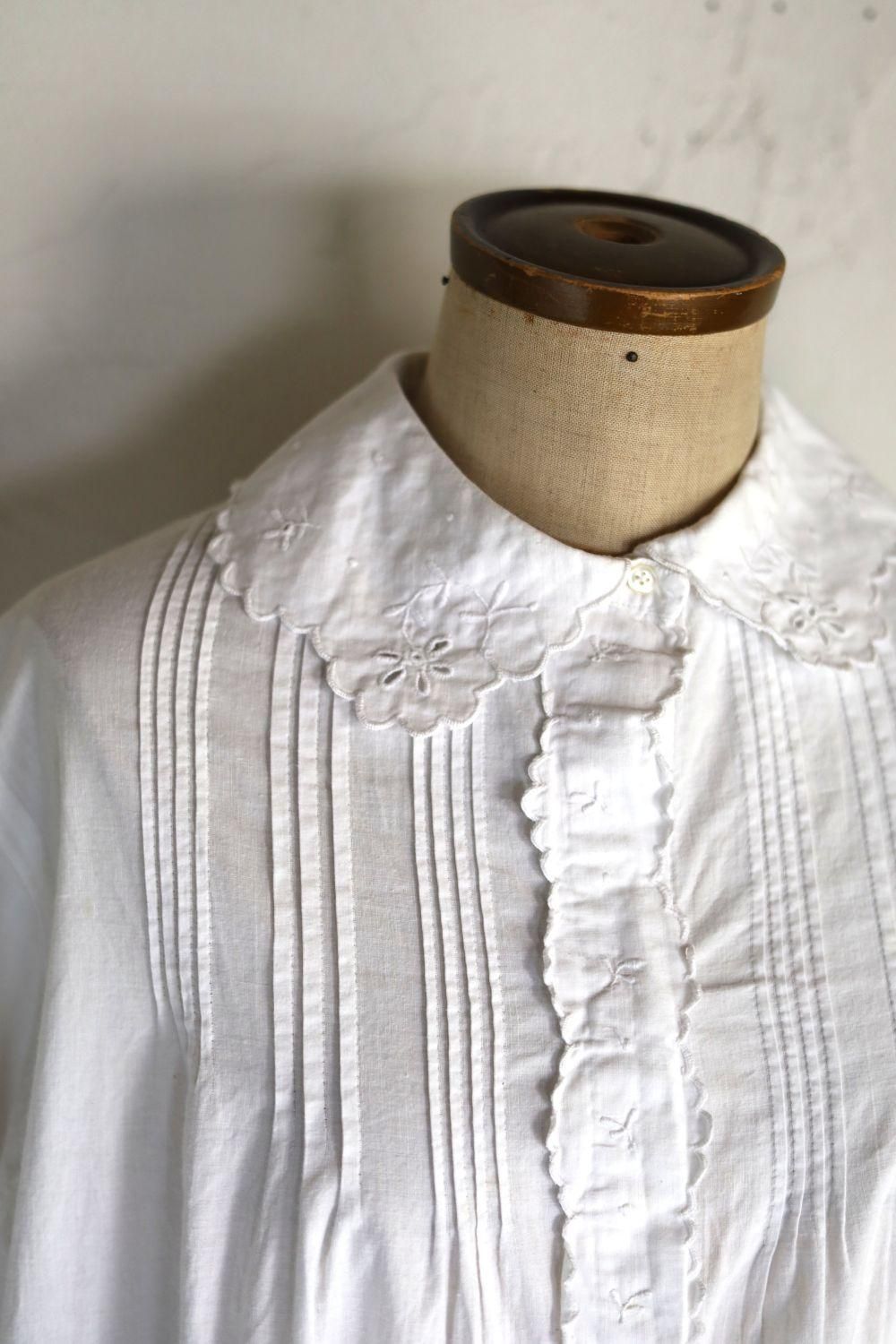 花模様が刺繍された襟元とふんわり広がる袖のシルエット、清々しく愛らしいコットンワンピース。折り返しの袖口や細かいプリーツなど、ヴィンテージならではのデザインが詰まっています。