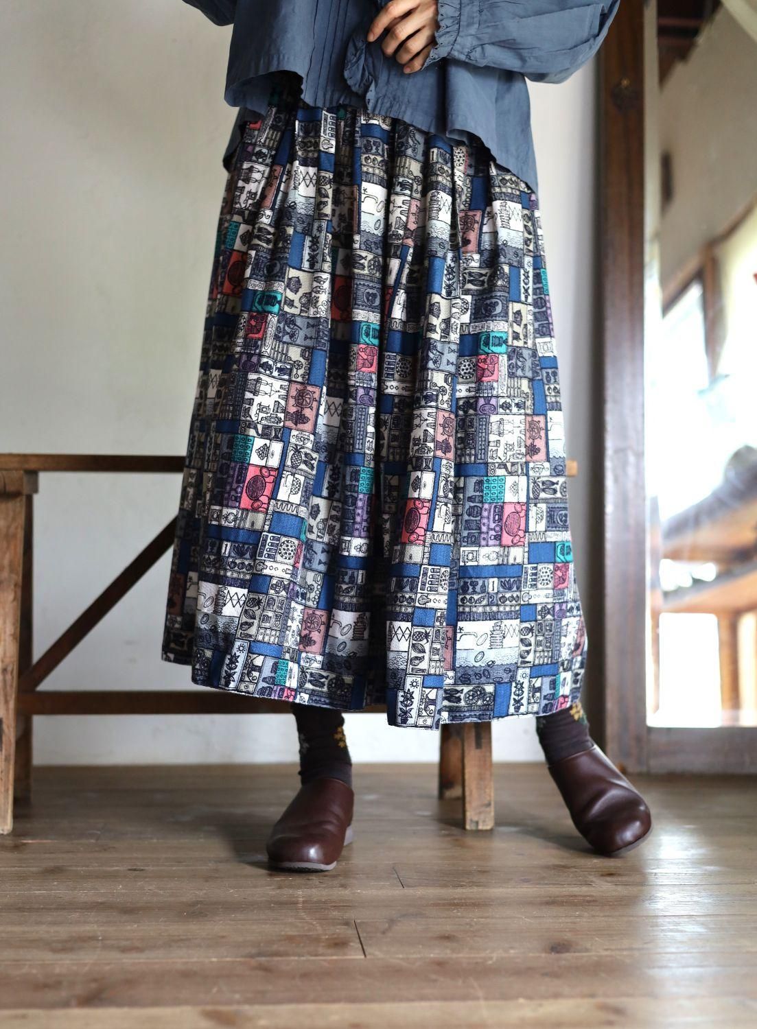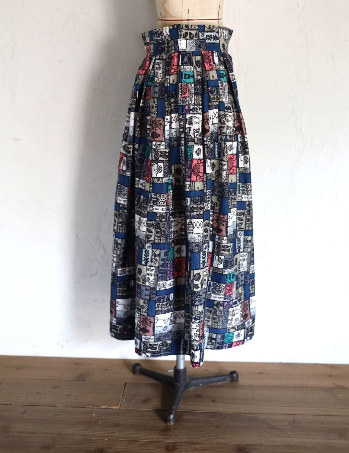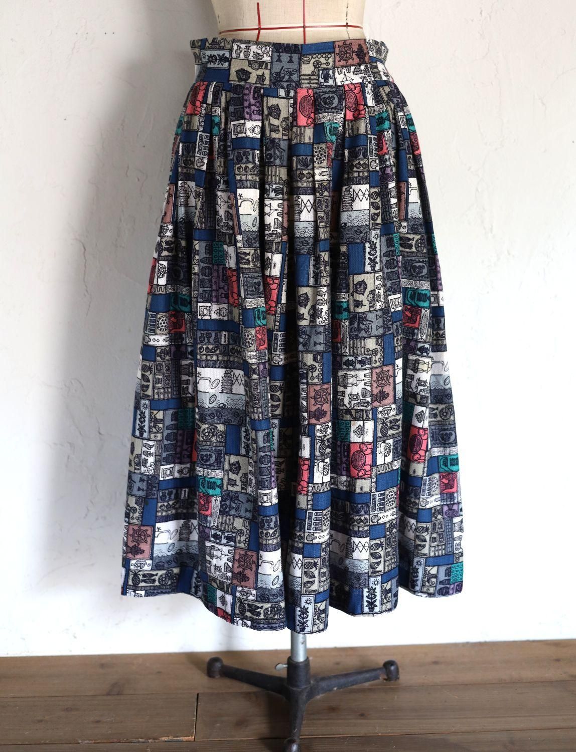 パッチワークのように彩られたプリントスカート、一つ一つをよく見ると、パイナップルやボウル、ボトルやお花など、キッチンにまつわる道具が描かれています。な一枚。中にはお皿を洗っているシンクの様子まで!ピンクの効いた色合わせもかわいく、少しユニークなヴィンテージらしいプリントスカートです。