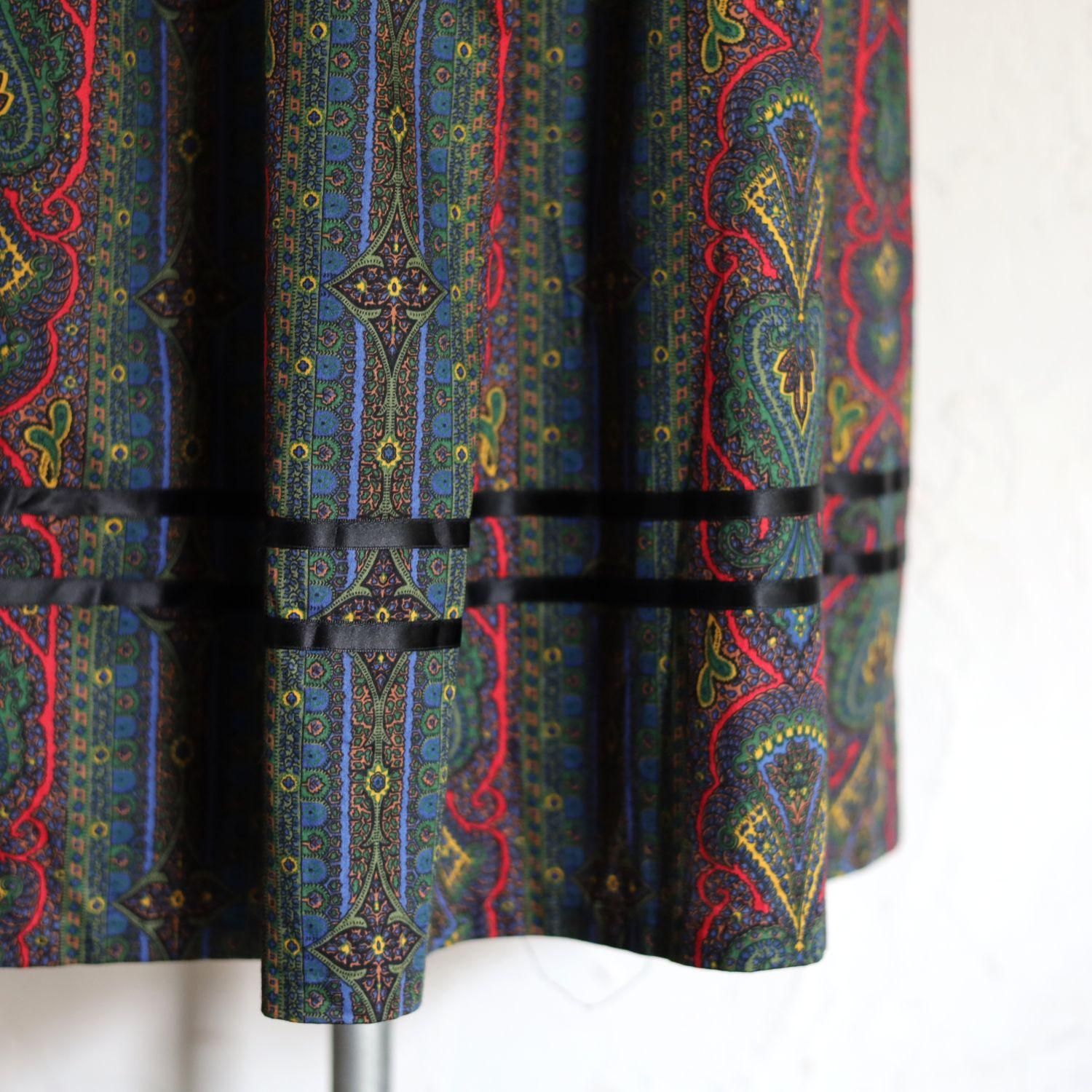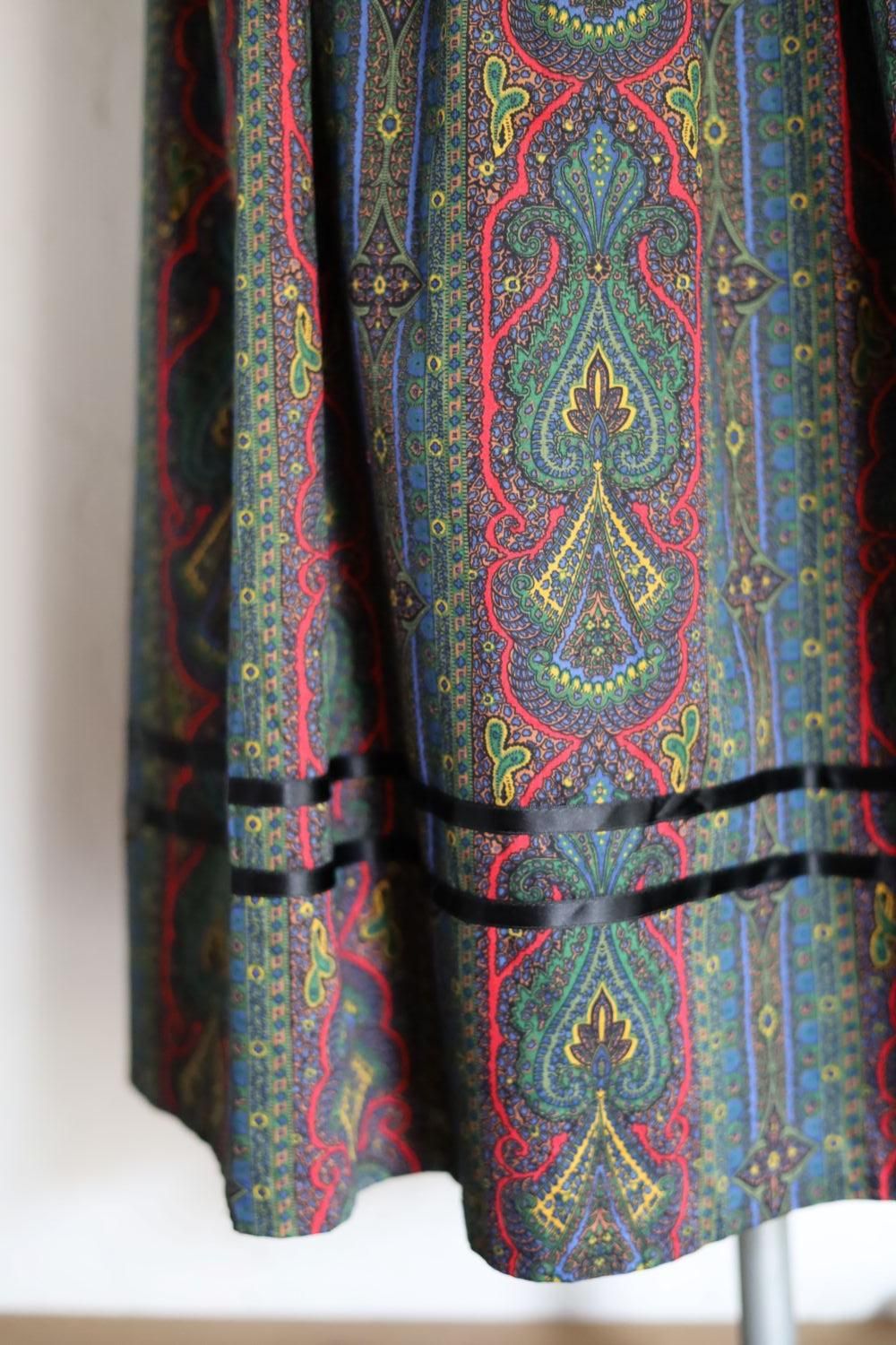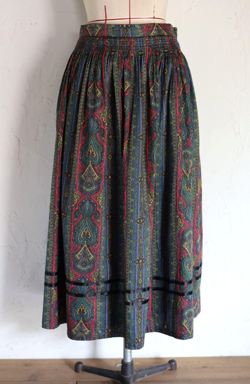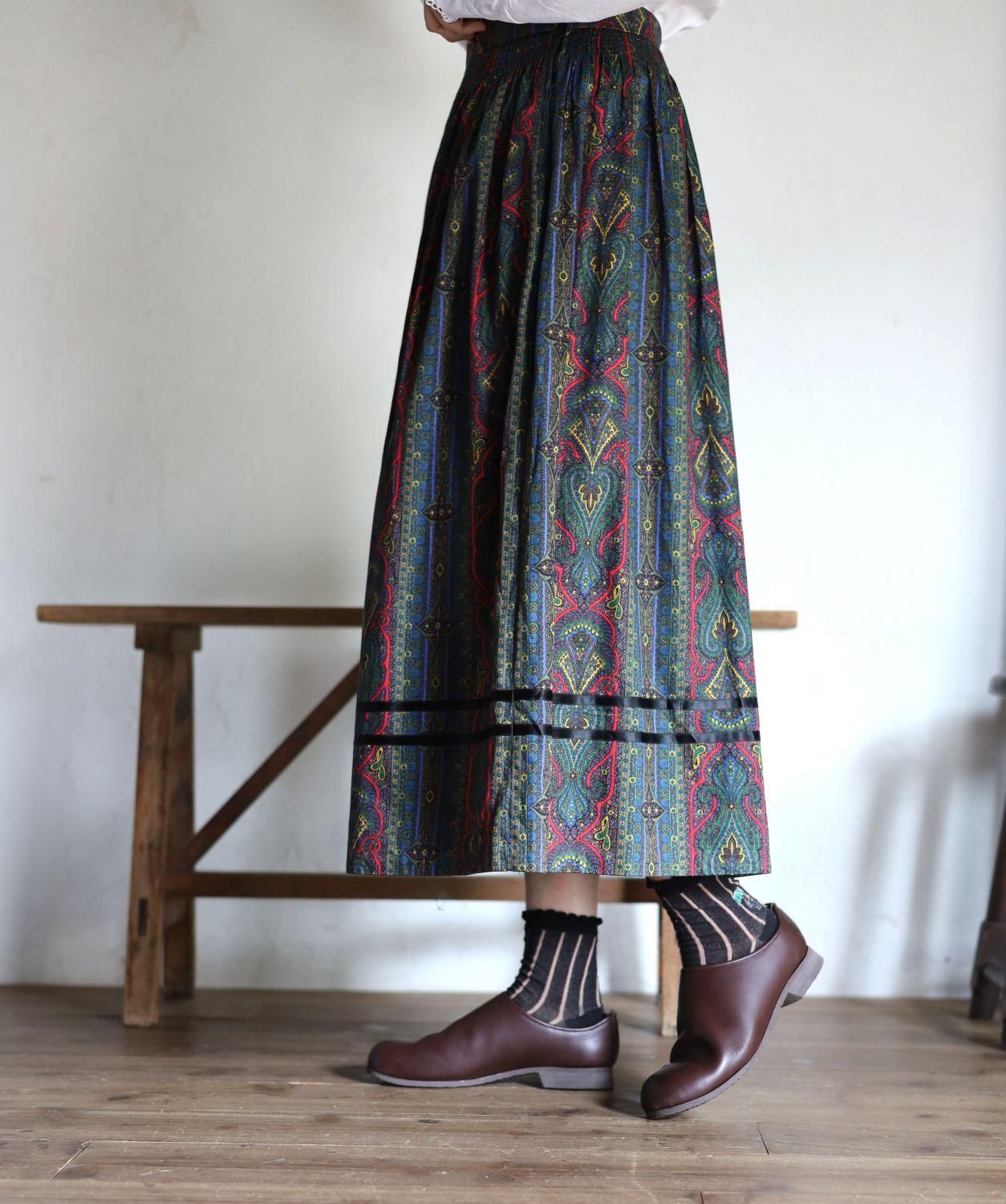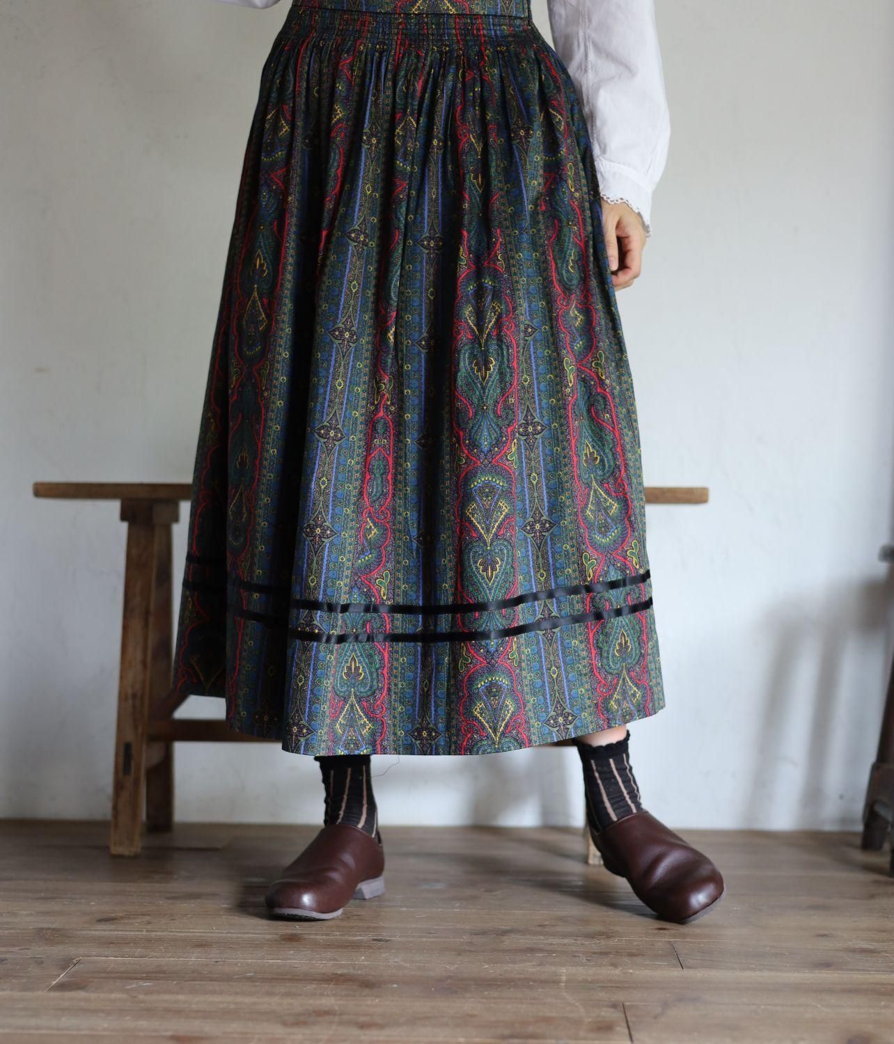 オーストリアとイタリアに跨る山岳地帯、チロル地方のスカート。ビビットな色がアクセントになりつつも、落ち着いたブルーやグリーンがベースになっているので上品な印象にまとまっています。