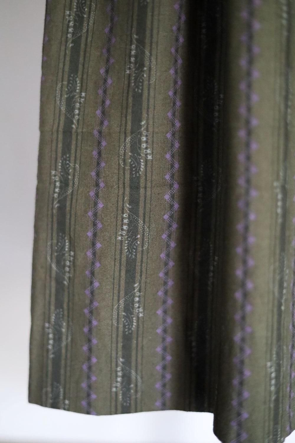 モスグリーンベースの落ち着いた色調の中に、よく見ると小さなスズランの模様。主張しすぎない密かな愛らしさで上品に着られる一枚です。