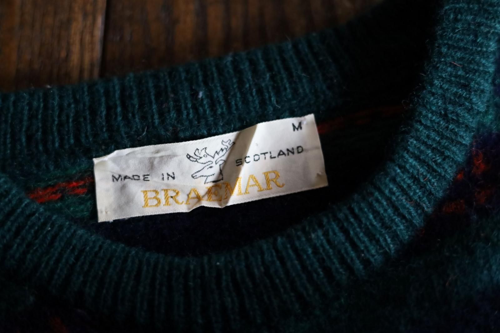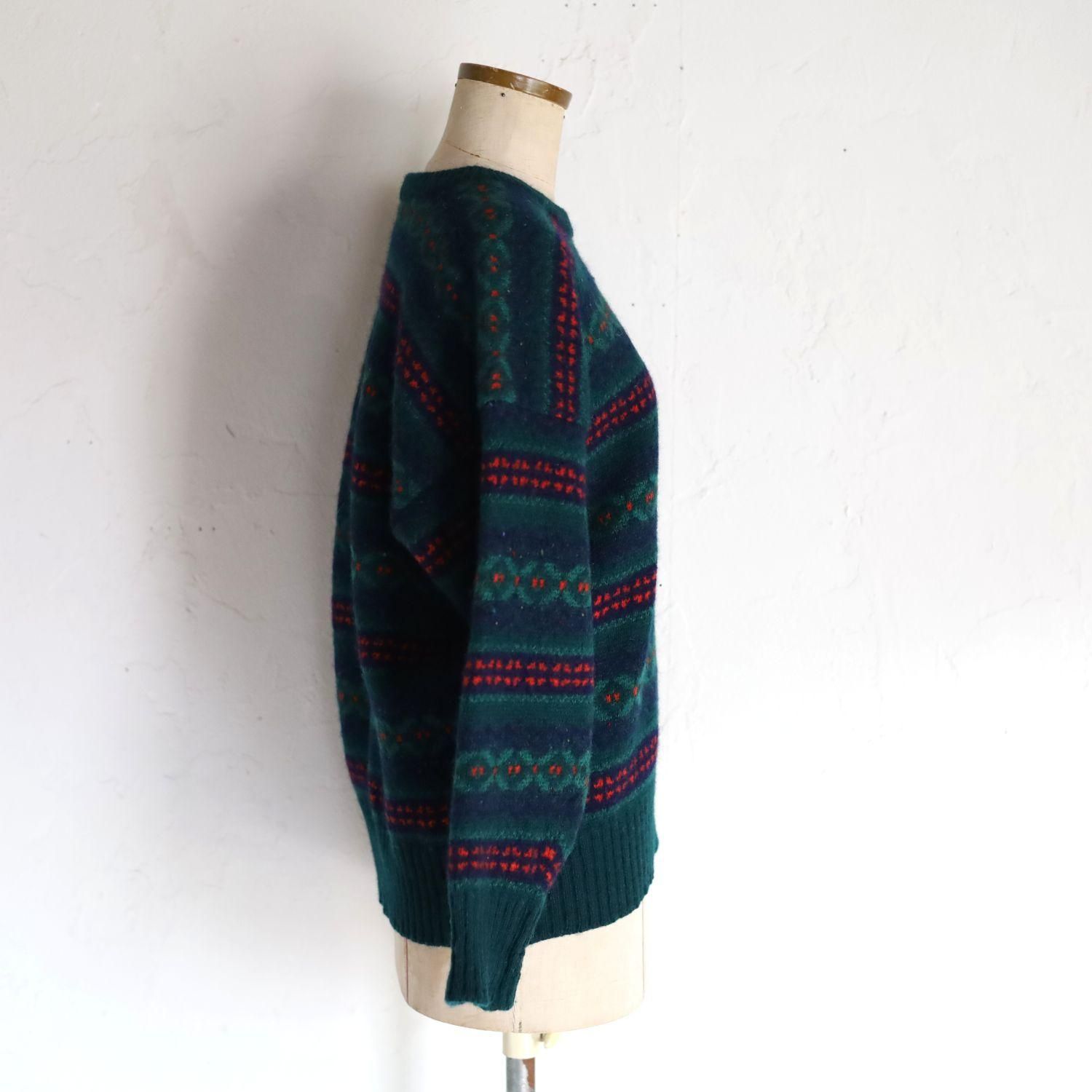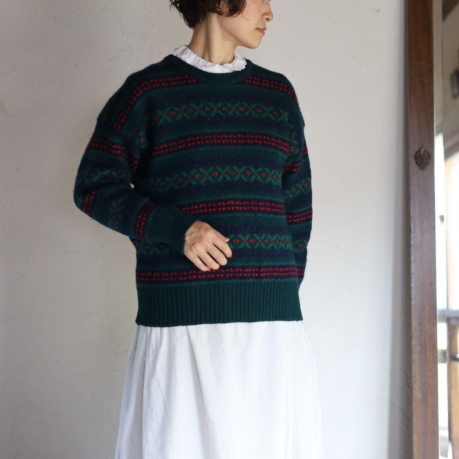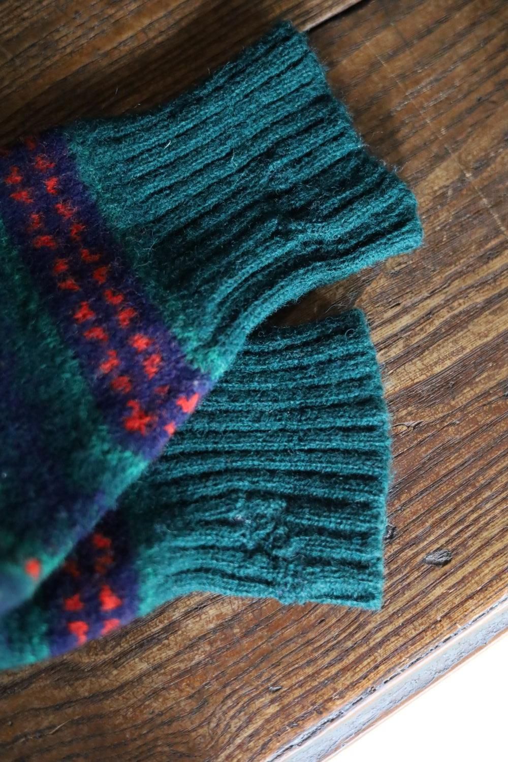 ヒイラギやクローバーの葉っぱのようにも見える幾何学模様のニット。深いブルーとグリーンの中に編み込まれた赤の毛糸が華やいだ表情に。きゅっと目が詰まって暖か。袖口にお直し跡がありますが、大事に着ていたことが伝わる一枚です。スコットランド製。